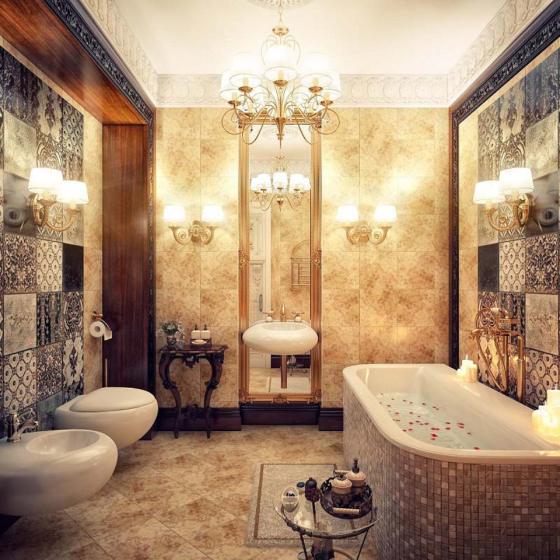 Bạn yêu thích sự cổ điển, sang trọng và cuốn hút thì mẫu nhà vệ sinh số 7 là gợi ý mà bạn không thể bỏ qua. Sử dụng tông màu vàng lấp lánh cùng những vật dụng sang trọng ảnh mang đến những phút giây thư giãn thật thoải mái cho bạn.